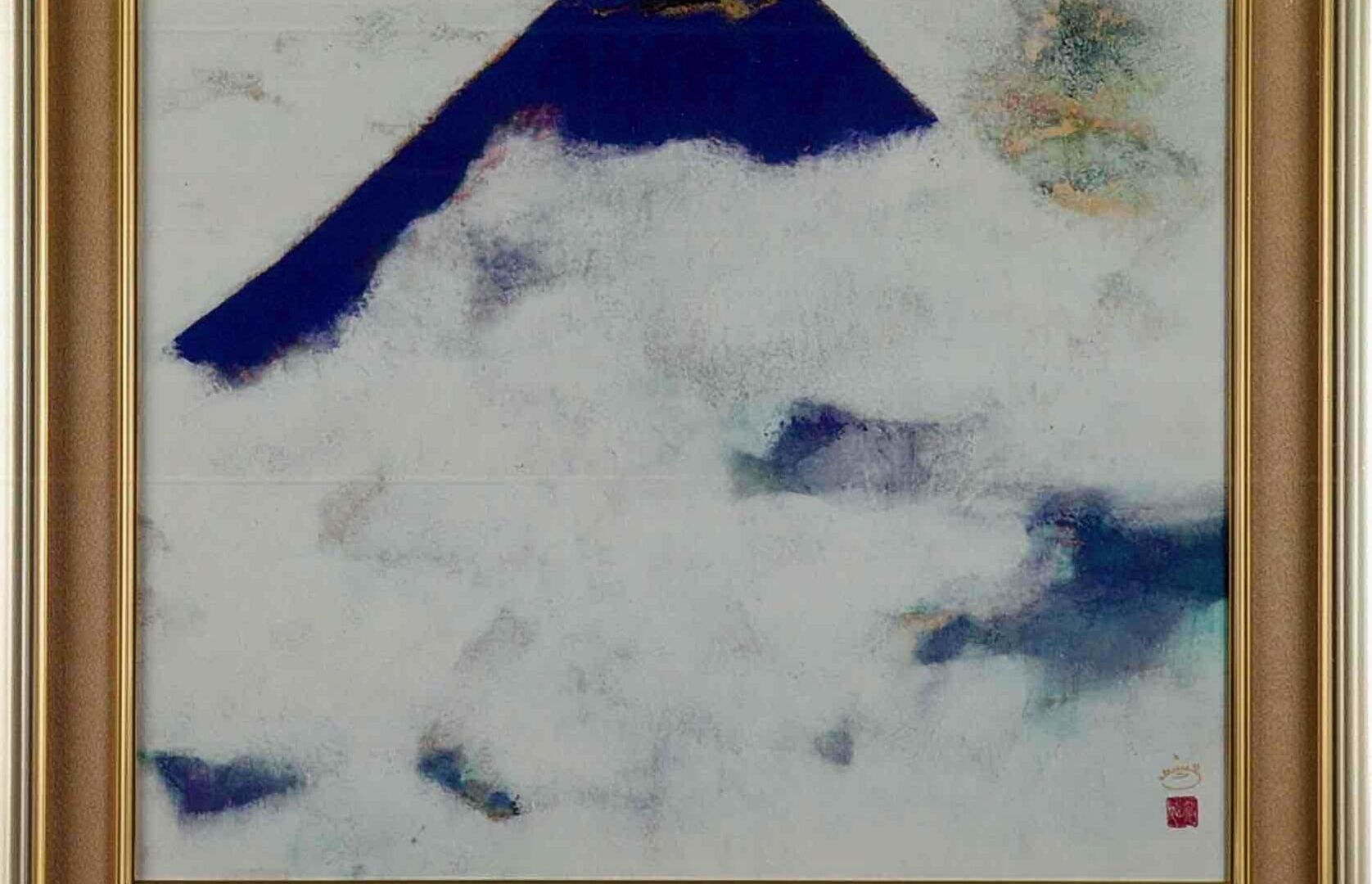 鮮やかな青空のもとにそびえる富士の姿を題材とした本作は、象徴的な風景を通じて観る者の内面を揺さぶる一枚である。「富士」は日本の精神風景を体現するモチーフとして多くの芸術家によって採り上げられてきたが、村上裕二は単なる写実ではなく、色彩の強度と空間の広がりによって、その存在感を詩的に表現している。青という色は、静寂や永遠、また天空を連想させると同時に、精神の深層への誘いとして機能する。本作は、自然の美と象徴の力を大胆な色調で結びつけ、日本画に内在する余白の詩性を引き出した作品である。