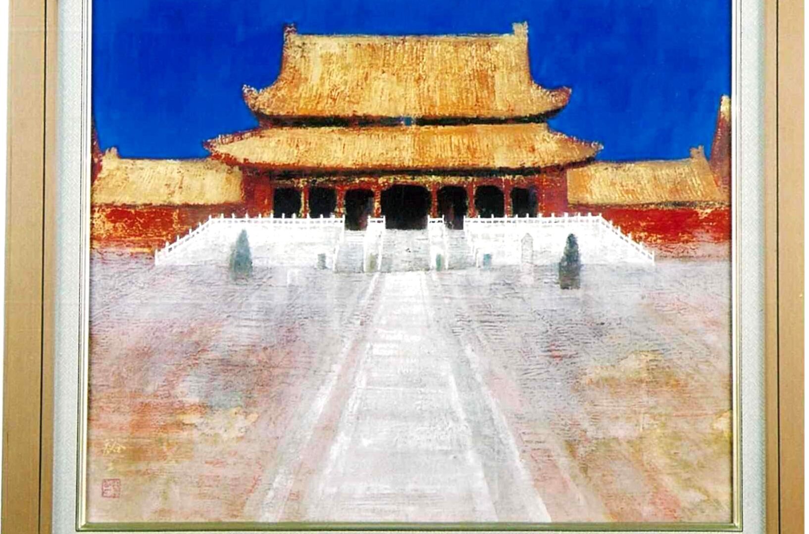 広々とした青空に包まれた都市の象徴として「紫禁城」を掲げた作品です。紫禁城は中国・北京に実在する歴史的建造物であり、長い時間と文化の重層を内包する場所として世界的に知られています。村上はこの象徴性を、日本画の繊細な色彩と空間表現によって捉え直し、建築の存在感と大気の広がりを一体として描いています。青空は物理的な空間であると同時に、精神的な解放と歴史の視座を象徴し、見る者を過去と現在、内と外の往還へと誘います。本作は、具体的なモチーフと象徴の重なりを通じて、時間と記憶、そして普遍的な「場」の感覚を問いかける一枚です。